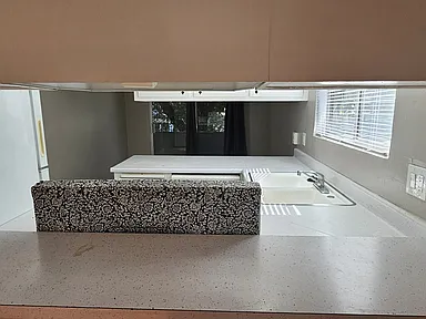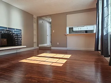 The kitchen includes a refrigerator, electric range/oven, dishwasher, and plenty of cabinetry with a breakfast bar that opens to a dedicated dining area. The living room boasts a brick-accented fireplace and built-in shelving. Both bedrooms are spacious, one with a walk-in closet and the other with mirrored closet doors. The bathroom has a full shower/tub combo and an updated vanity.